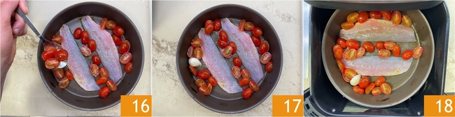Add one-quarter of the tomatoes to the tray 16, trying not to overlap them on the fillets 17. Now set the air fryer temperature to 338°F and insert the basket 18.