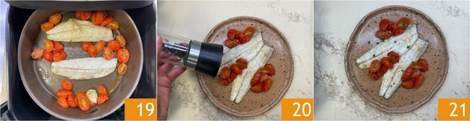 Cook for 7 minutes 19, or until the sea bass is cooked and the cherry tomatoes are juicy 19. Just before serving, season with black pepper 20. The air-fryer sea bass is ready to be served 21.