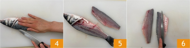 Now, using a sharp knife, cut along the back of the sea bass 4 to obtain the first fillet 5. Fillet the other side as well and remove the fattier parts 6, keeping the skin on.