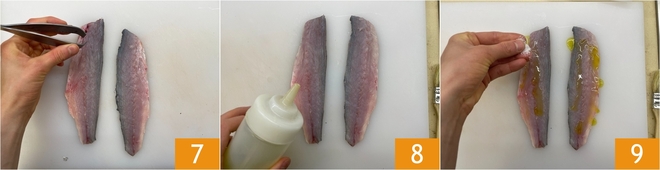 Use kitchen tweezers to make sure you remove all the bones from the fillet 7. Season with extra virgin olive oil 8 and a pinch of salt 9. From 4 sea bass you'll get 2 fillets per serving.