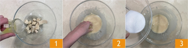 To prepare the almond and lemon cookies, first cut the marzipan into cubes and place it in a bowl. Gradually add the lemon juice 1 and mix with your hands until dissolved 2. Then add the granulated sugar 3.