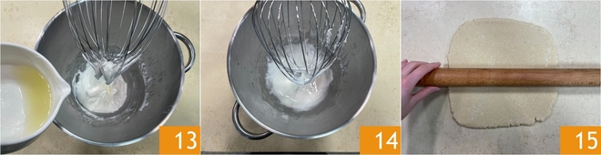Continue to beat the mixture for about 10 minutes and finally add the juice of half a lemon 13. Mix for a few more moments 14 and set aside. Retrieve the almond dough and roll it out on a lightly floured surface with almond flour, using a rolling pin to achieve a thickness of 1/4 inch 15.