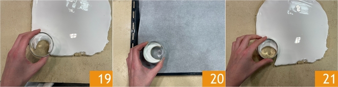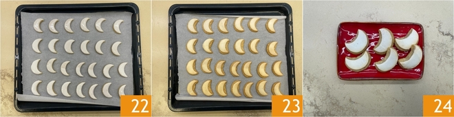 Now form the first crescent using the cookie cutter 19 and place it on a baking sheet lined with parchment paper 20. Continue forming the other crescents using the cookie cutter 21. Each time you reuse the cookie cutter, dip it in water, which you have in a small bowl nearby.