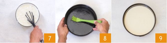 then continue with a hand whisk 7 until you obtain a homogeneous mixture. Grease a 9-inch diameter mold 8 and pour in the batter 9. Bake the cake in a static oven preheated to 350°F for about 40 minutes (perform the toothpick test before taking it out).
