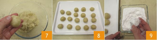 Transfer the dough into a bowl, lightly wet your hands, and form balls weighing about 1 oz each 7: you should get 18 balls of this size 8. Coat each ball with powdered sugar that you have placed in a separate bowl 9.