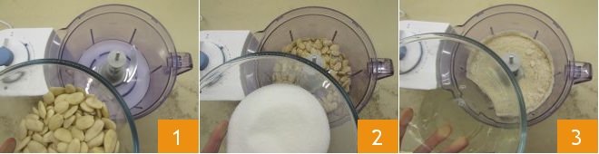 To prepare the almond paste pinches, place the whole peeled almonds in a food processor with steel blades 1, add the sugar 2, and chop them into a powder. At this point, add the egg whites 3,