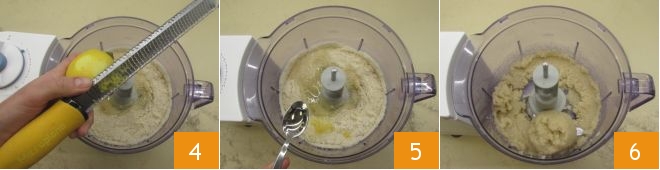 grated lemon zest 4, and almond extract 5. Process the mixture in the food processor until you get a soft but compact dough 6.