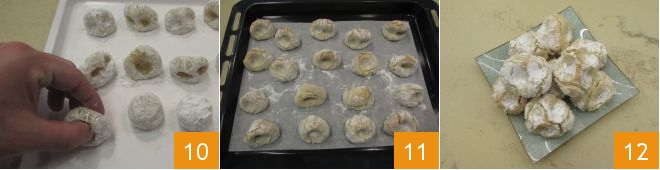 Place the sugar-coated balls on a tray lined with parchment paper and pinch the top, squeezing them between your three fingers: index, middle, and thumb 10. Once all the pinches are ready, let them rest in the refrigerator for at least 5 hours or even overnight. After resting, transfer everything to a baking sheet and bake in a fan oven on the middle rack at 350°F for about 12 minutes, until they are slightly golden 11. Once cooled, your almond paste pinches are ready to be tasted 12!