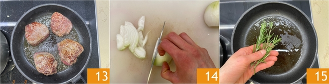 Sear them for 2-3 minutes per side until a nice crust forms 13, then transfer them to a plate and keep warm. Now, peel and slice the onion 14. In the same skillet where you seared the meat, heat a drizzle of oil with rosemary 15.<\/p>