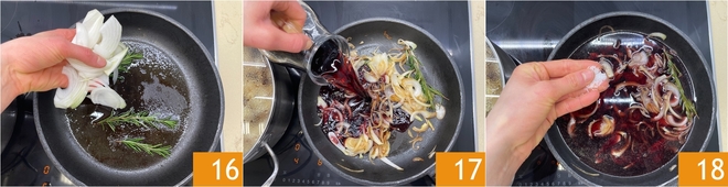 Add the onion and sauté for a couple of minutes 16, then pour in the Amarone 17; let it evaporate, then salt 18 and let it reduce for about 15 minutes on low heat.