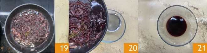 When the onions are soft and the base is reduced 19, strain everything through a sieve 20 to obtain a smooth sauce 21.