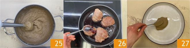 You should obtain a smooth and homogeneous sauce 25. Return the medallions to the skillet with the Amarone sauce, turn the heat back on and coat them 26 for about a minute on medium heat, just long enough to warm them without cooking further. Plate by distributing the mushroom and cauliflower cream on the bottom 27.<\/p>