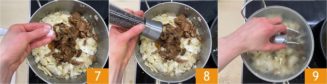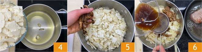 Add the cauliflower 4 and briefly sauté it. Retrieve the softened mushrooms and add them to the cauliflower 5, along with their filtered soaking water 6.<\/p>