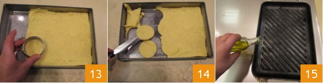 Retrieve the polenta and, using a pastry cutter 2 1/2 inches in diameter 13, obtain 8 discs 14. Heat a grill and drizzle with 2 tsp of oil 15,