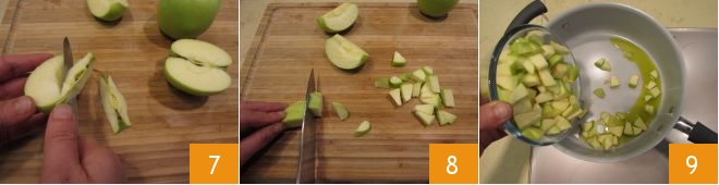 In the meantime, take care of the apples. Cut them into 4 parts and remove the core 7, get chunks of about a couple of inches and place them in a container 8. Heat 1 1/2 tbsp of oil in a pan, then add the apples 9.