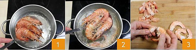 To prepare the rice ring with mozzarella and shrimp heart, start with the preparation of the shrimp (alternatively, you can use prawns): take the shrimp and set aside 1/3 (they will be used for the final garnish), blanch the rest of the shrimp for a few minutes in boiling water 1, let them sit for 4-5 minutes, and drain them with a slotted spoon 2; let them cool for a couple of minutes and then proceed with cleaning them. Remove the head 3, legs, peel off the shell and tail, and remove the intestinal vein from the back, making sure to set aside the heads and shells, which will be used for the broth. For more details, consult the How to clean shrimp guide from the Cooking School. (Alternatively, you can clean the raw shrimp, cut them into pieces, and sauté them in a pan with oil for a few minutes).