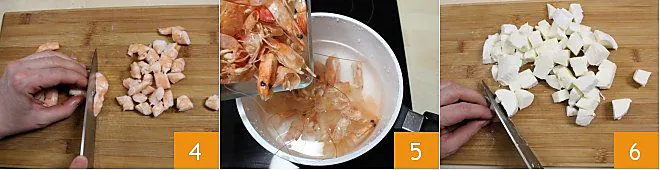 Once cleaned, cut them into small pieces 4 and set them aside. Now, prepare the broth: fill a small pot with 17 oz (500 ml) of water and add the shrimp scraps 5 that you set aside after cleaning (head, shell, tail). Cook for at least 30 minutes to flavor the broth. Once ready, strain the broth through a sieve and set it aside; it will be used for cooking the risotto. (For an even richer taste, prepare the broth following the Shellfish Stock guide from the Cooking School). Cut the mozzarella into pieces 6,