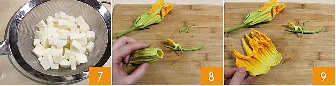 place it in a sieve to remove the preservation water 7. Take the zucchini flowers, remove the stem, gently open the flowers with your fingers and extract the fleshy pistils inside and at the base of the flowers, remove the stalk 8, make a cut along the long side and open them 9.
