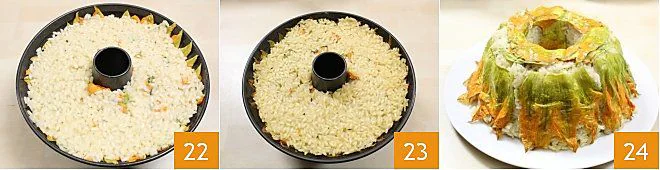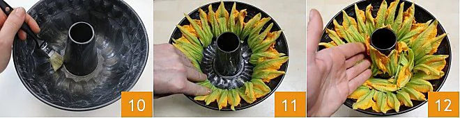 Grease a bundt pan with a top diameter of 9 inches and a capacity of 7 cups 10, line the walls of the pan with the zucchini flowers (11-12), and set aside the leftover flowers, which will be used for the risotto.