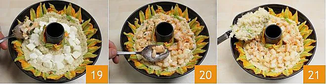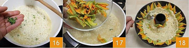 Halfway through the cooking, flavor the risotto with thyme 16 and add the leftover zucchini flowers 17. Continue cooking the rice, adding broth each time the rice has absorbed the previous one. Once ready, let the risotto cool slightly. At this point, you can assemble the ring: take the pan you lined with zucchini flowers: fill the pan with half the rice, level the surface with the back of a spoon, and press the center of the rice to form a hollow 18; then raise the rice on the sides to better accommodate the filling.