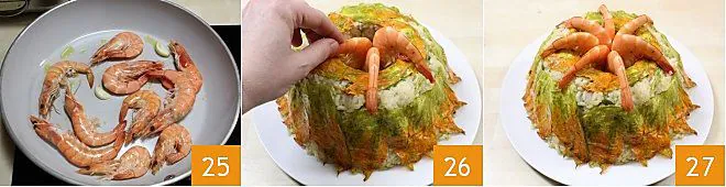 Finish the dish by garnishing the ring with the shrimp set aside: in a pan with oil and a clove of garlic, sauté the whole shrimp with shells 25 for a few minutes, then place them in the center of the ring, laying them with the tail facing outward 26. Your rice ring with mozzarella and shrimp heart is now ready to be served 27.