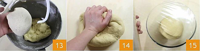 At this point, add the starter to the dough 13 a little at a time and continue kneading with the hook until the starter is fully incorporated. Transfer the dough to a floured surface and work it 14 until you get a smooth and uniform ball. Place the dough in a bowl and cover it with plastic wrap 15; let it rise in a turned-off oven with the light on for 2 hours