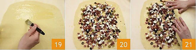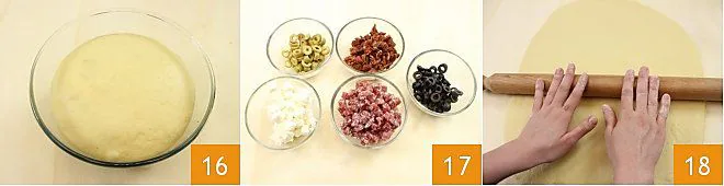 until the dough doubles in size 16. Now, prepare the filling: slice the green and black olives, dice the salami and feta into regular cubes, and chop the sun-dried tomatoes 17. Take the risen dough and roll it out with a rolling pin to a thickness of about 1/5 inch trying to obtain a rectangular shape 18.
