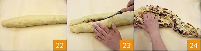 Roll until you get a roll 22. Cut the roll in half with a thin bladed knife 23 and floured (so it doesn't stick to the dough), then separate the two parts and twist them, keeping the cut side up to reveal the sections and its filling 34.