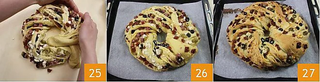 Shape the braid into a ring and seal the two ends by overlapping them 25, place the angelica on a baking sheet lined with parchment paper 26, and let it rise for 30 minutes in a turned-off oven with the light on until it doubles in size. After 30 minutes, bake the savory beer angelica in a preheated static oven at 355°F for 35 minutes (or in a fan oven at 320°F for 25 minutes). When the surface is golden, remove the savory beer angelica from the oven 27 and let it cool slightly before serving.