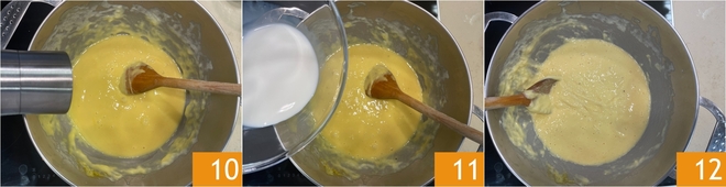 Pepper 10 and stir again. At this point pour about 3.4 fl oz (about 0.42 cups) of the reserved milk 11; adjust the amount based on the consistency of the fondue, which should be neither too runny nor too firm. In total the cooking will take about 30 minutes 12.