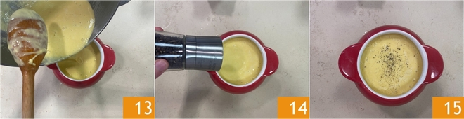 Once ready, pour the fondue into the typical fondue and bourguignonne pot 13, with a small burner underneath that will keep the fondue warm and preserve its fluid consistency. Garnish with pepper to taste 14 and serve your Valdostana fondue immediately 15!
