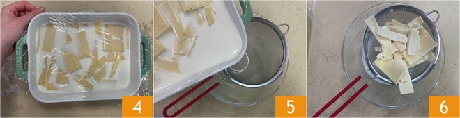 Cover with plastic wrap 4 and let rest in the refrigerator overnight. After the resting time, drain the cheese from the milk through a sieve 5 and set the milk aside 6.