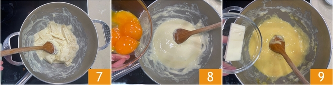 In a mixing bowl set over a pot for bain-marie cooking, place the drained cheese. Melt the cheese over medium heat stirring with a wooden spoon 7. At first you'll see a mass, then gradually it will melt and become more fluid. At this point add the yolks one at a time 8, stirring continuously. Also incorporate the cold butter 9 and continue stirring.