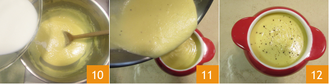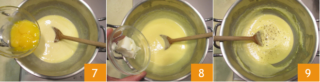 At first, you will see a mass, then little by little it will melt and become more fluid. At this point, add the egg yolks one at a time 7, and keep stirring continuously. Also incorporate the cold butter 8 and continue to stir. Pepper the Aosta Valley fondue to taste 9 and stir again.