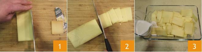 To prepare the Aosta Valley fondue, first remove the outer crust of the fontina 1, then slice it thinly 2. Transfer the cheese to a rectangular baking dish and pour the milk over it 3.