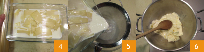 Cover with plastic wrap 4 and leave in the fridge overnight. After the resting time in the fridge, drain the cheese from the milk using a sieve 5 and set the milk aside. In a double boiler, place the drained cheese. Melt the cheese over medium heat, stirring with a wooden spoon 6.