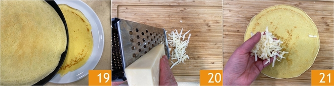 Stack the crêpes on a plate as they are ready 19. You are ready to fill the crêpes: grate the fontina cheese with a large-holed grater 20 and spread it over the surface of the first crêpe 21.