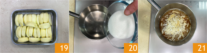 Prepare the apples: peel 16 and cut them into wedges 17, place them on a baking dish lined with parchment paper 18.
