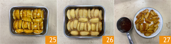 Bake in a preheated static oven at 356°F for 30-40 minutes 25. Remove from the oven 26 and separate the caramel from the apples 27.