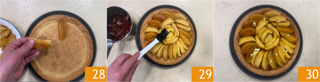 Now arrange the apples on the pastry 28 in a radial pattern. Then heat the caramel and brush it over the apples 29. The apple and caramel tart is ready; you can embellish it as you wish with gold leaves 30.