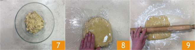 Knead to obtain a smooth and homogeneous mixture 7, form a dough ball, wrap it in plastic wrap, and place it in the fridge for 1 hour 8. Roll out the pastry with a rolling pin 9 to a thickness of 1/8 inch.