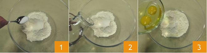 To make the apple and chocolate pockets, first prepare the dough: sift the flour and yeast into a bowl, add the salt 1, water 2, and eggs 3