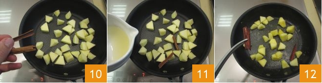 Now place the apple cubes in a pan, add the cinnamon sticks 10 and lemon juice 11 and sauté over high heat for 5 minutes, then remove the cinnamon 12.