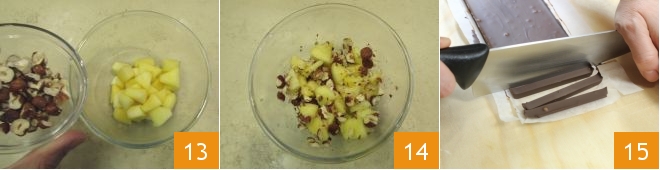 Transfer the apples to a bowl, add the chopped hazelnuts 13, mix well, and let cool 14. Finally, cut the chocolate bar into sticks 15.