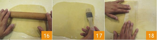 After the dough has rested, divide it into 2 portions which you will roll out with a rolling pin to form a rectangle of about 14x8 inches, then brush the surface with a little water 17. Fold one long side of the rectangle towards the center 18,
