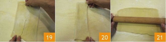 do the same with the opposite side 19 and further brush the obtained rectangle with water, then fold it in half lengthwise 20 to obtain a rectangle of about 6x8 inches. Let the dough rest for a couple of minutes, then roll out the rectangle again with the rolling pin using a little flour 21. Preheat the oven to 356°F in static mode.
