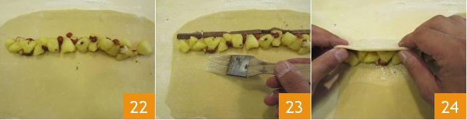 At this point, you can add the filling: place the apple and hazelnut mixture a few inches from the top edge of the rectangle 22, add the chocolate sticks and brush the bottom part with water 23; fold the top edge towards you to cover the filling 34 and press gently with your fingers to seal the dough.