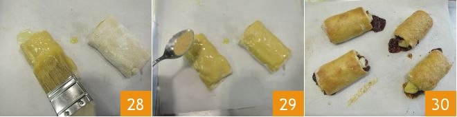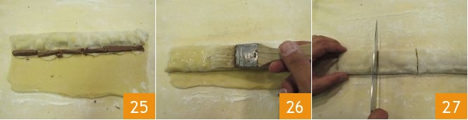 Add another row of chocolate sticks 25, brush the bottom part and continue folding the dough until you reach the other end of the rectangle. Finally, brush the surface of the obtained roll with a little water 26 and seal it by pressing gently. Keeping the seam side down, divide each roll into 4 parts 27
