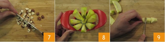 In the meantime, prepare the filling: roughly chop the hazelnuts 7, then wash the apple and cut it into wedges, removing the core 8. Finally, peel the apple wedges and cut them into cubes 9.