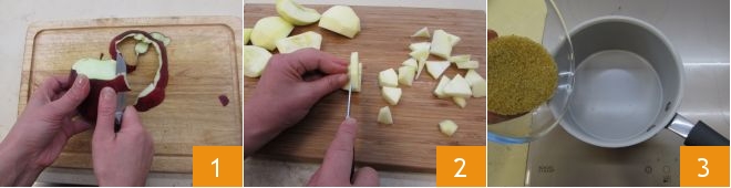To prepare the apple and culatello pastry, start with the filling. Take the apples, cut them in half and peel them 1. Remove the core and cut them first into wedges, then into cubes 2. Then take a non-stick pan with high sides and add the sugar 3.